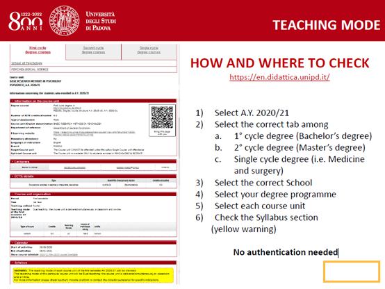 帕多瓦大学全体教职工在过去的一段时间内做了很多工作,如购置设备,进行混合教学,确保学生上课的灵活性;购置新教室、对原教室座位进行重新安排,确保学生学习期间保持安全距离;对大学教职工进行新冠病毒检测;研发了OrariUniPD App,让学生更方便快捷地查询课程时间、上课方式,并通过该应用登记学生上课所就坐的座位,以便精确追踪等。