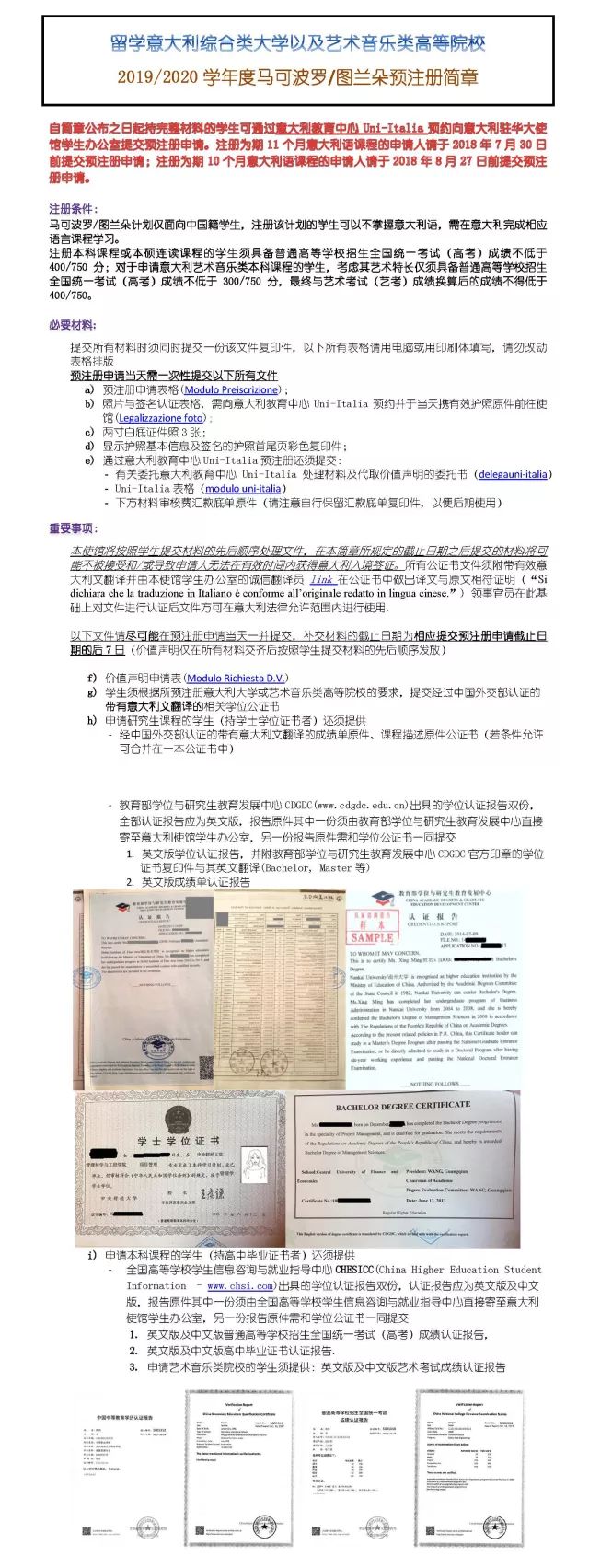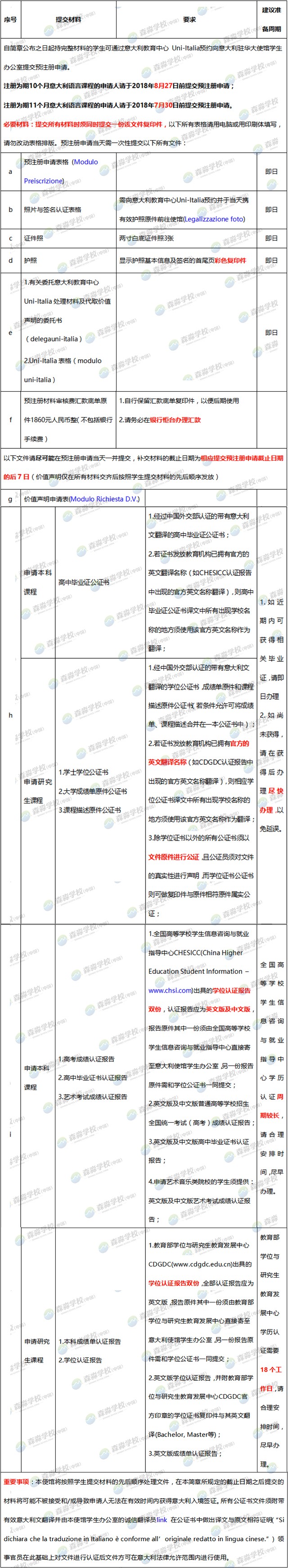 继2018/2019意大利国际生北京、广州和重庆三个领区留学政策发布之后,上海领区的预注册指南也于近日公布!以下为本年度的预注册指南: 根据以上意大利驻上海领事馆公布的2018/2019国际生上海领区政策指南,森淼学校资深专家进行了新旧政策深入对比,希望为广大考生提供更专业的意大利留学政策分析。 新旧政策深入对比 为了帮助更多同学准备好2018/2019意大利国际生上海领区预注册申请,淼淼特别精心做了一个材料准备攻略,请大家仔细观看,速速着手准备起来。根据历史情况表明,越早准备材料,后期应对调整更从容,也避免了很多意外情况的发生。 森淼TIPS ▶ 预注册申请一旦提交,将不得修改申请表上任何有关申请的大学/学院的信息; ▶ 本领馆仅接收户口所在地属于本领馆领区范围内学生的预注册申请,领区管辖范围为上海、安徽、江苏和浙江。根据户口所在地确定所属领区; ▶ 提交预注册申请当日仍未满18周岁的学生,预注册当天须由父母一方陪同, 提交经外办认证的父母双方同意书公证和亲属关系公证原件; ▶ 已持有价值声明的学生须将该价值声明的原件在申请预注册时一并提交; ▶ 以往参加过预注册的学生须重新提交预注册申请表格和照片认证表格,重新申请价值声明,而相关学位、成绩单、课程描述公证书可再次使用; ▶ 所有申请夏季预注册意大利语课程的学生,除毕业于意大利语专业的学生以外,必须拥有意大利语语言水平证书; ▶ 注册英语授课课程的学生必须提英语等级证书,同时还须提供由意大利大学、学院出具的相关证明,证明该课程为英语授课课程; ▶ 请务必在银行柜台办理服务费汇款,保留纸质回折,建议保留电子扫描件以防再次需要; ▶ 所有材料需尽早准备,以避免由于审核机关的周期限制所带来的延误。如有必要,办理加急业务;