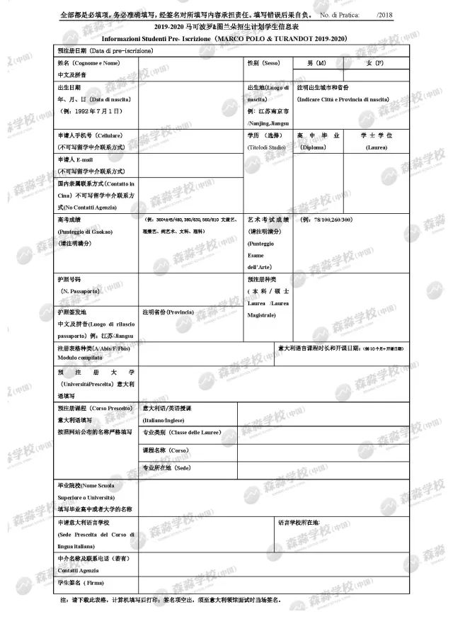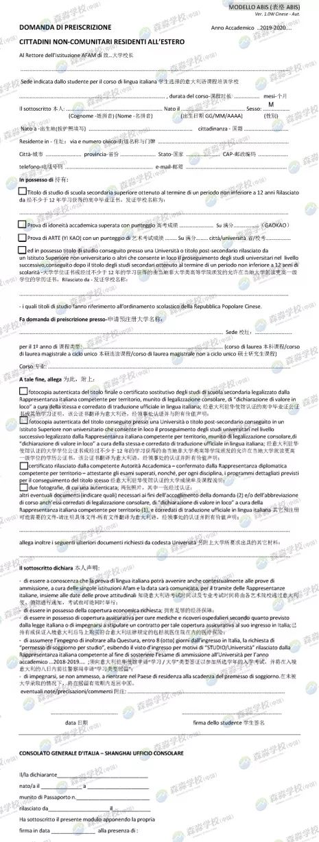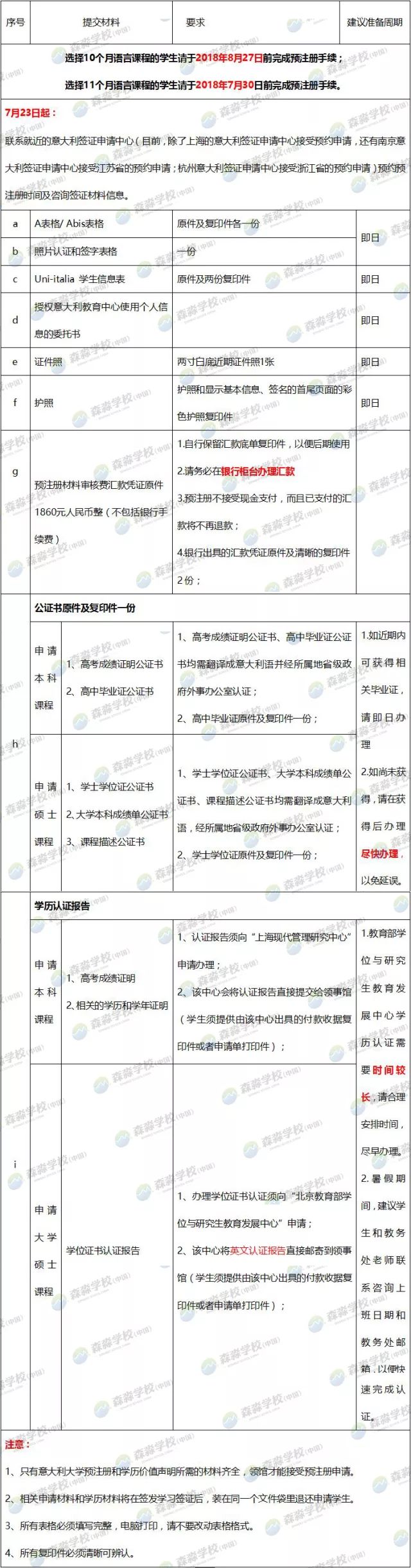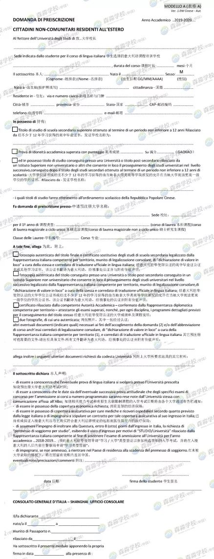 ▶ 2019/2020学年计划生的申请提交材料清单 为了帮助更多同学准备好2019/200学年计划生的申请,淼淼精心做了一个材料准备攻略,请大家仔细观看,速速着手准备起来。根据历史情况表明,越早准备材料,后期应对调整更从容,也避免了很多意外情况的发生。 ▶ 森淼TIPS √ 申请大学本科的学生必须在中国接受小学至高中12 年制的学历教育,如果只有11 年制则需一年大学教育证明; √ 本领馆仅接收户口所在地属于本领馆辖区(上海、江苏、浙江和安徽)学生的预注册申请; √ 预注册申请提交后,不得修改申请表上任何有关申请的学校/学院的信息; √ 预注册申请当日仍未满18周岁的学生,预注册当天须由父母一方陪同,提交经外办认证的父母双方同意书公证和亲属关系公证原件; √ 以往参加过预注册的学生须重新提交预注册申请表格和照片认证表格,重新申请价值声明,而相关学位、成绩单、课程描述公证书可再次使用; √ 学生或者其委托人在领取材料时,请仔细核对材料内容; √ 意大利签证申请中心的地址和对外开放时间,请查询: http://www.vfsglobal.cn/italy/china/Shanghai/contact_us.html √ 意大利大学课程设置及招生名额,请查询: www.studiare-in-italia.it/studentistranieri √ 咨询意大利驻上海总领事馆Uni-Italia意大利教育中心办公室,获取综合类大学以及艺术音乐类高等院校招生课程及名额的相关信息,以及预注册表格填写的相关指导。 e-mail: shanghai@uni-italia.it; 电话:021 65965900-116/180 森 淼 学 校 森淼学校是经意大利官方授权,集意大利语培训及考试、意大利留学服务为一体的综合性培训学校。学校开办十多年来,因语言培训全外教模式、被意大利多个官方机构认可的国际考试资格及数万名成功留学案例,以实力赢得了意大利官方及众多学生和家长的信赖和好评。 |