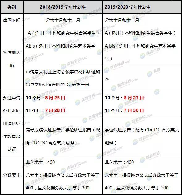 ▶ 预注册申请要求 根据以上公布的2019/2020学年马可波罗-图兰朵计划招生简章,学生预注册申请需要满足如下分数要求: √ 申请意大利综合类院校本科课程的学生高考成绩不得低于400/750; √ 申请意大利艺术类本科课程学生需按照公式计算成绩(公式:[高考成绩+(艺术分÷艺术成绩总分)×750] ÷2),换算的最终成绩不得低于400分(满分 750 分),其中高考成绩不得低于300/750; ▶ 预注册申请填写的资料 申请2019/2020学年马可波罗-图兰朵计划的学生,需要填写以下预注册申请表格: √ 表格A(适用于本科和研究生综合类学生) √ 表格ABIS(适用于本科和研究生艺术类学生) √ 照片认证和签字表格 √ Uni-italia 学生信息表 √ 授权意大利教育中心使用个人信息的委托书 点击文末“阅读原文”,下载预注册表格 新旧计划生招生简章重要区别