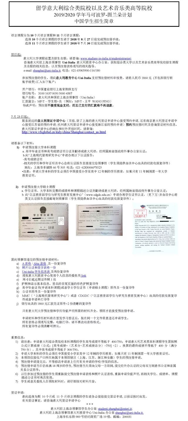今日,留学意大利综合类院校以及艺术音乐类高等院校2019/2020学年马可波罗-图兰朵计划招生简章已经公布了。选择马可波罗-图兰朵计划的中国学生,你的预注册申请材料准备齐全了吗?查看以下公布的2019/2020学年预注册申请必备材料,现在知道还不晚! 2019/2020年上海领区计划生招生简章: