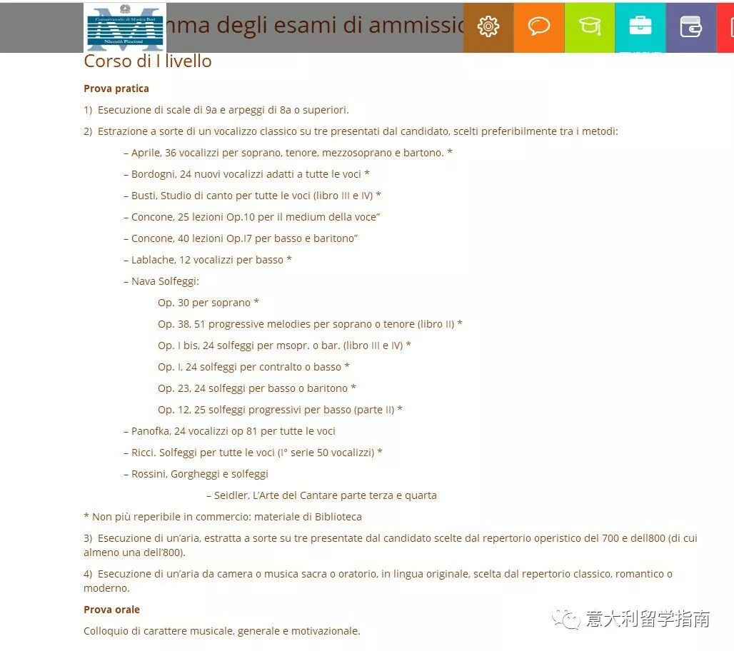 巴里音乐学院位于意大利南部的普利亚大区,是普利亚大区的首府,也是南部非常大的一个海滨城市,号称是意大利最大的音乐学院。据曾就读于巴里音乐学院歌剧方向研究生学长介绍,巴里音乐学院两栋教学楼,加上一个修了无数年直到现在开放的音乐厅)。学校综合实力在国际音乐学院的排名还十分的靠前,强势专业有钢琴、小提琴、指挥、吉他、单簧管等等。 ![]() 接下来就是本篇文章的重头戏,小编给大家整理了巴里音乐学院声乐专业的入学考试要求。钢琴专业的学生不要急,小编正在紧急加工中ing~ 重头戏:巴里音乐学院入学考试