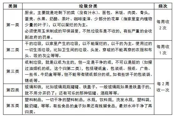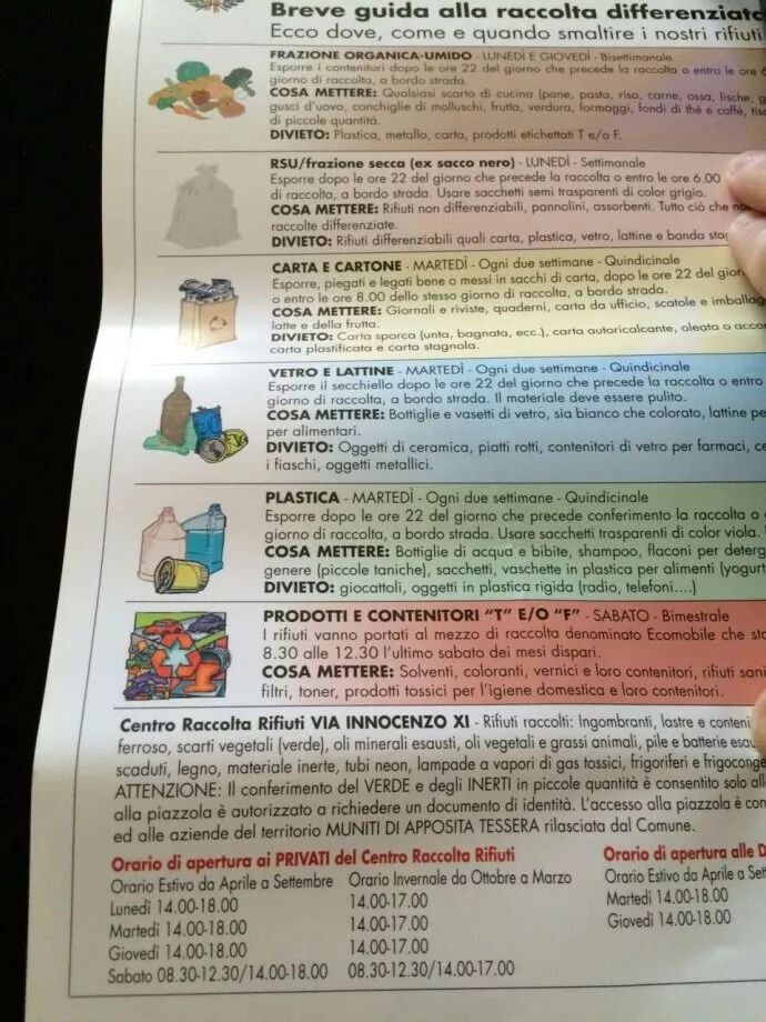 | 到了意大利,除了办理居留税号,一定要学会进行垃圾分类,这是非常重要的。以下是城市市政府发的分类明细,所有家庭都要按照规定进行分类。  整篇都是意大利文,大家能看懂吗?考验意大利语的时候到了。看不懂没关系,下面对垃圾分类进行了说明。 在意大利,日常垃圾分为6大类: - Umido 厨房有机垃圾 - Carta e Cartone 纸质垃圾 - Plastica 塑料类垃圾 - Metalli 金属类垃圾 - Vetro 玻璃 - Secco 不可回收垃圾 垃圾的分类,主要是按照垃圾桶的颜色来分!!!  每一类垃圾都有其专属的垃圾回收桶,不同地区有其各自细节要求,如有的地区将塑料与金属垃圾归为一类,有的地区将玻璃与金属垃圾归为一类,有的地区则将食用油、危险品单独回收。所以未来生活在意大利的朋友们,请按照城市的分类标准进行分类。  没有垃圾回收桶的居民区一般会有专人上门收集,这就需要于规定收集日前夜将指定垃圾放置于指定地点。 具体的垃圾分类,这个表格就能让你看清楚 ↓ ↓ ↓